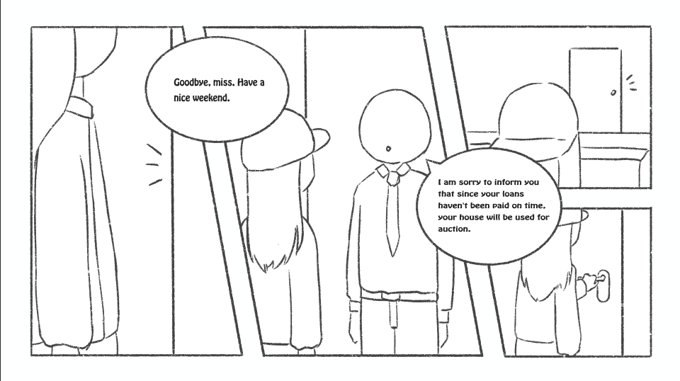 - The protagonist failed to pay the dwelling loans, so her house has to use in an auction. (This is not real in China, but might happen in America)